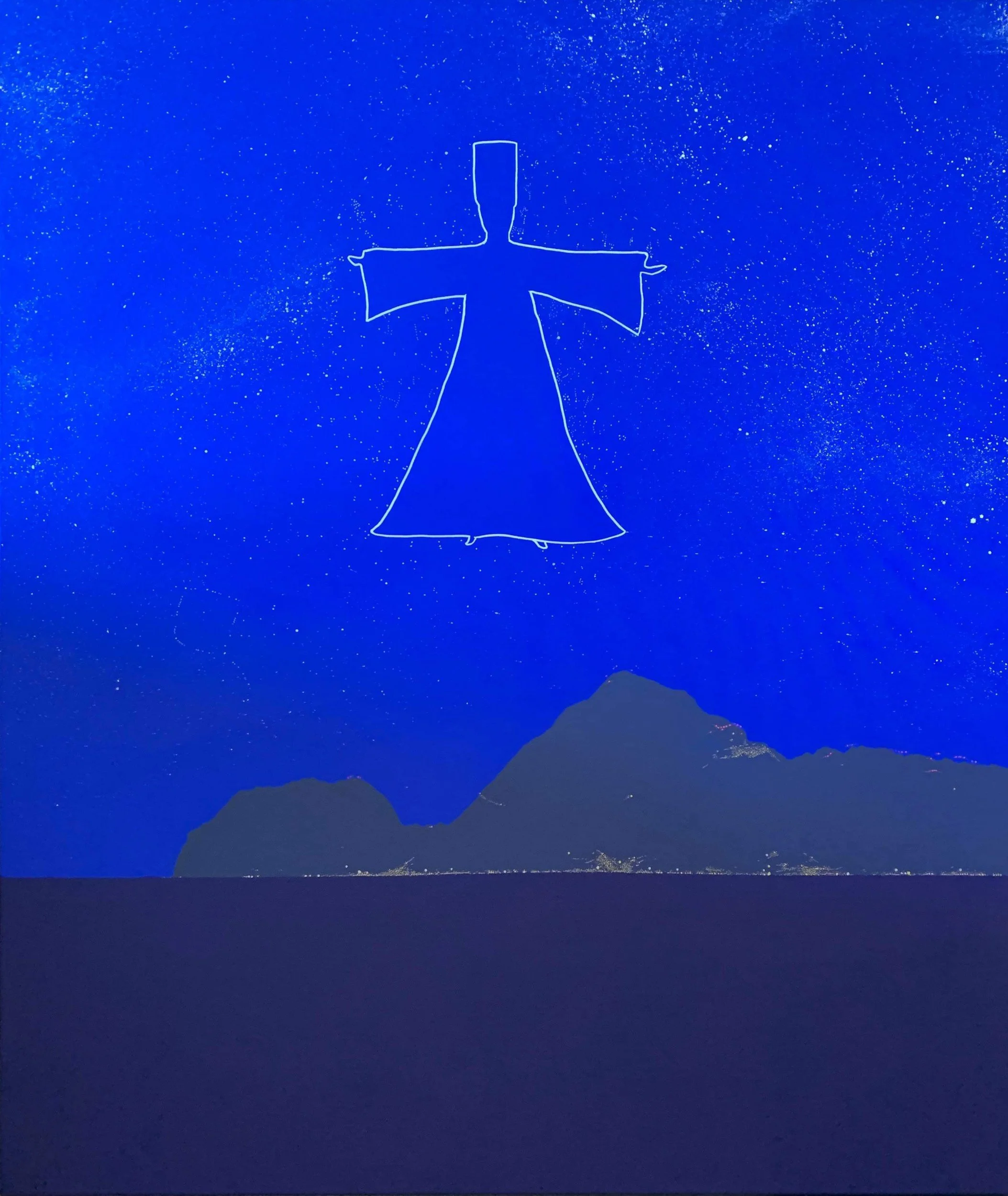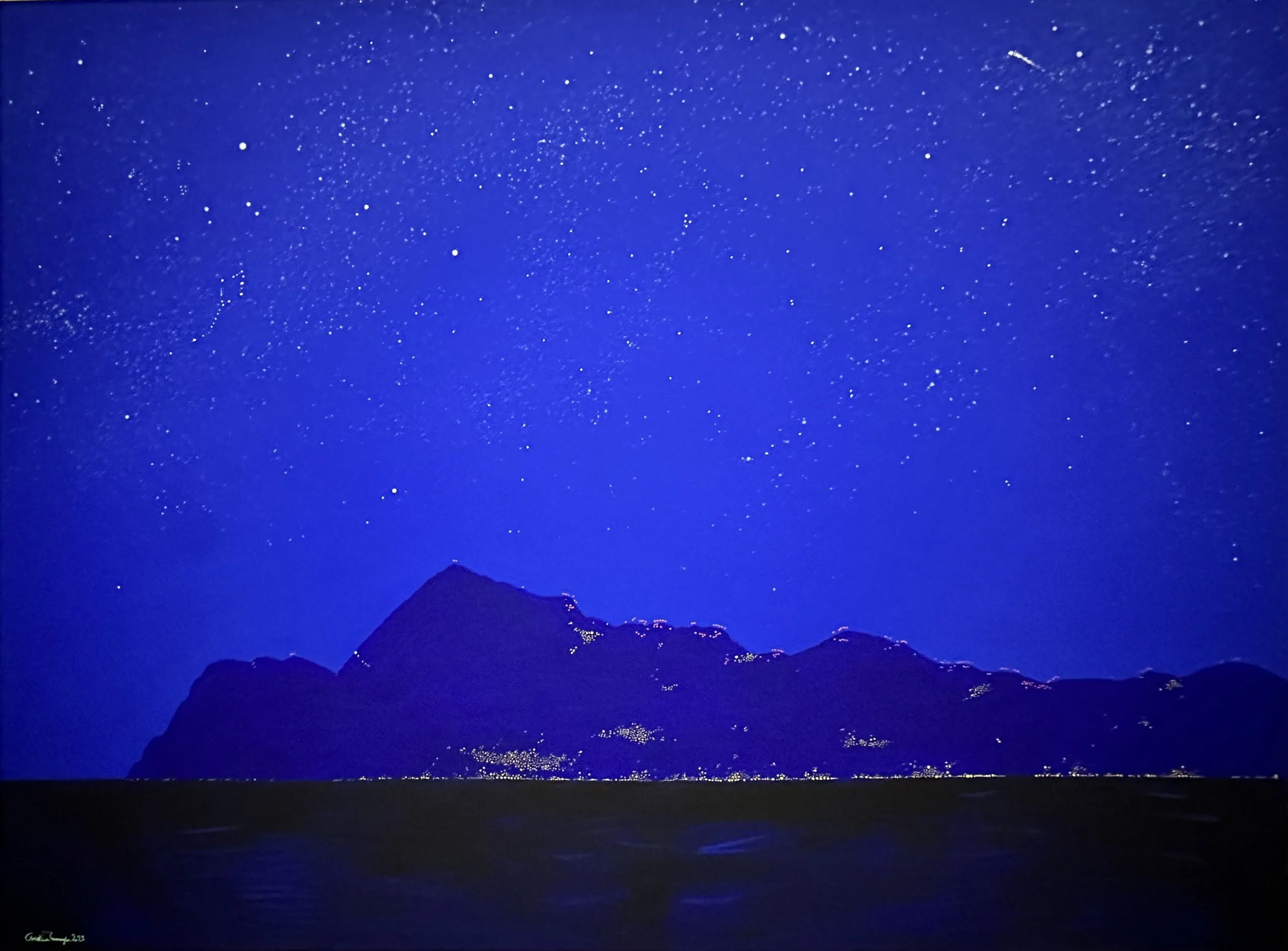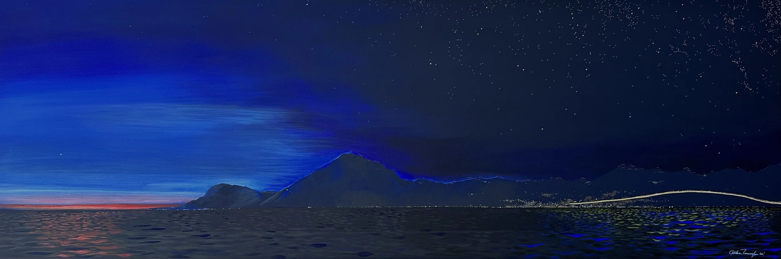 Commission piece for a very inspirational woman in Athens. It opens my heart whenever I get a chance to paint a piece from the Patraikos series. The sufi dances the eternal dance of the planets, where the stars reflect the lights on the land, lit by people as they occupy the space for a brief moment in time. And my favourite mountain is always there with its unwavering majesty, looking at us falling in love at Rio, having drinks at our favourite places and dancing to her beauty.