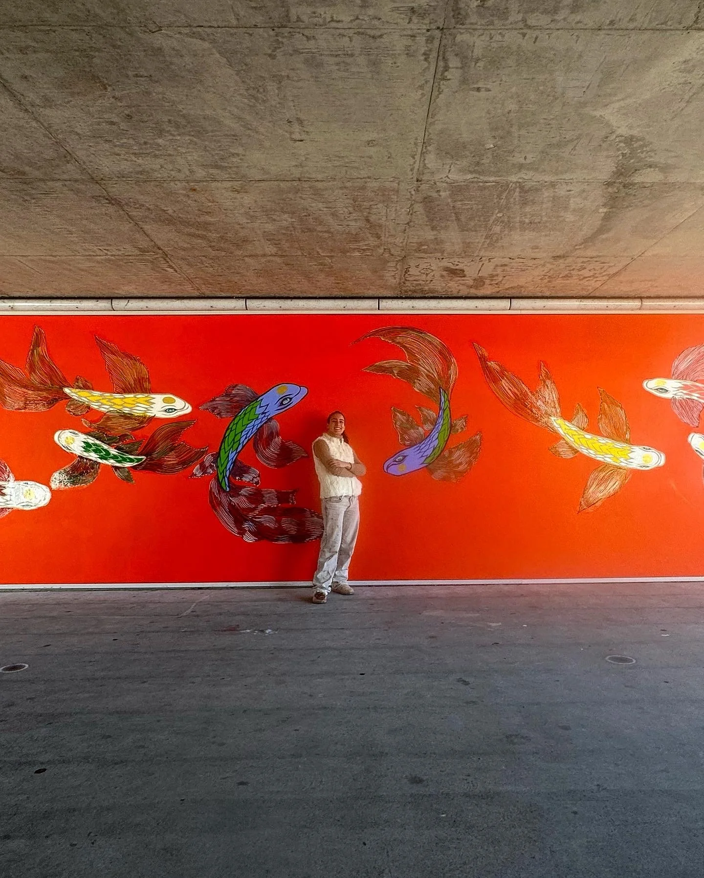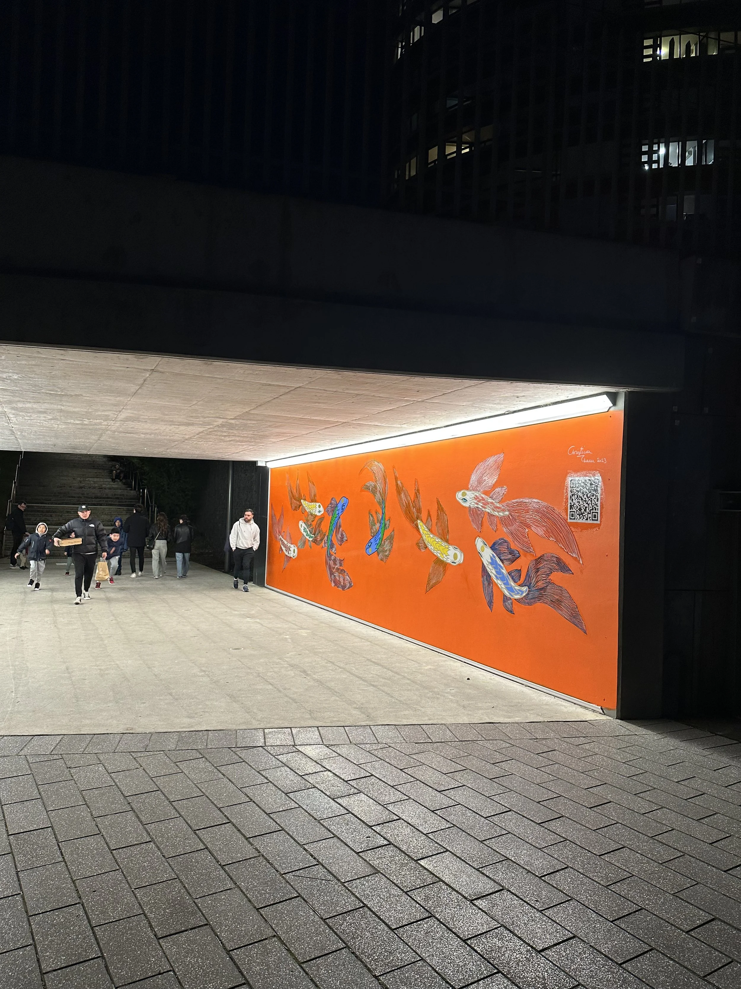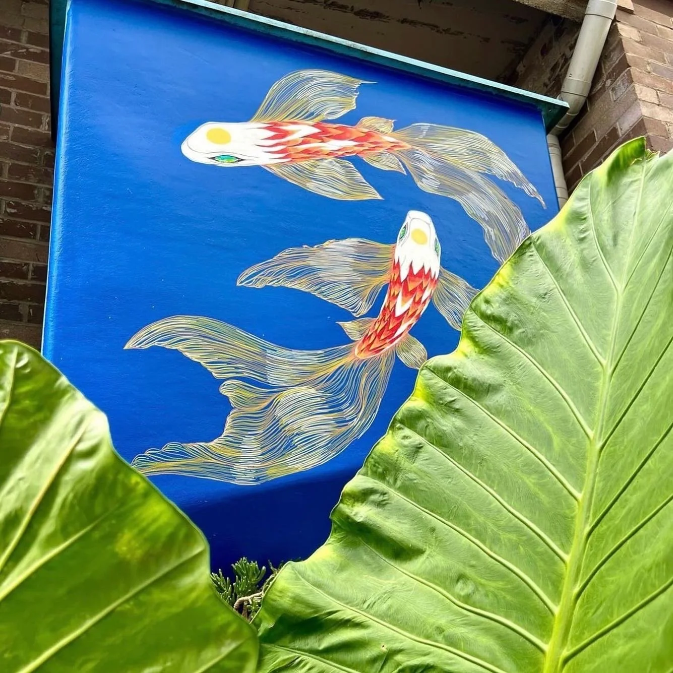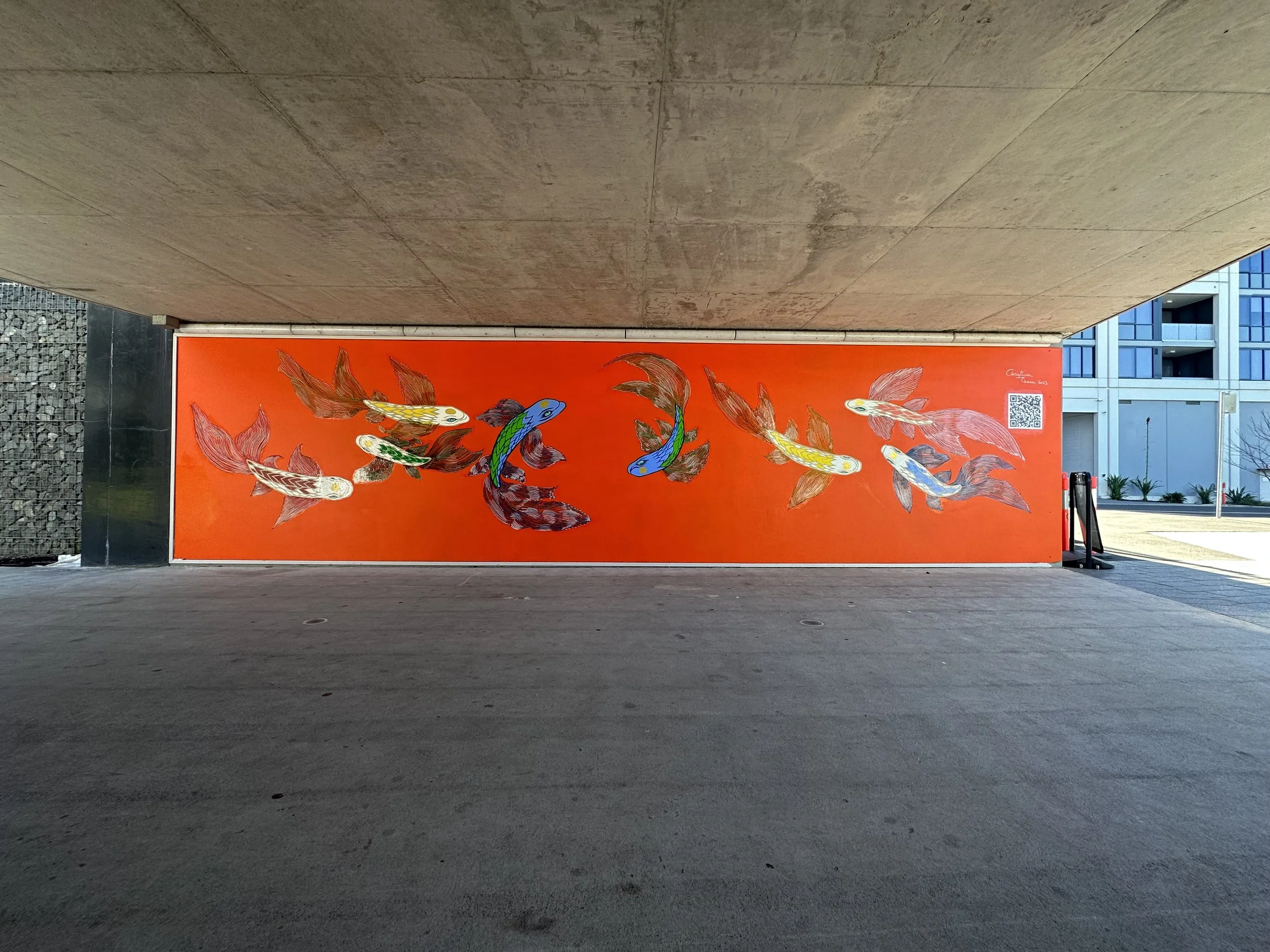 There are eight Koi fish of all colours on the wall. Number eight symbolises unity and ability to go with the flow. The design is fresh, with high energy, and a sense of community and protection. This message invites my neighbours and the community to remember that we should all look after each other and care for our fellow citizens. It is all about community spirit.